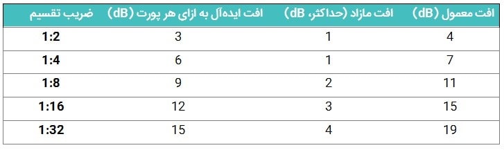 بیشتر اسپلیترهای PON، 1X32 یا 2X32 یا اعداد کوچکتری از توانهای دو هستند (2،4،8،16،32 و …) کوپلرها اصولا متقارناند (مثلا 32X32)،( اما ساختار PON به بیشتر از یک یا دو اتصال فیبر از طرف دفتر مرکزی نیاز ندارد، یکی برای استفاده و دیگری برای نظارت، تست و به عنوان زاپاس، پس بقیهی فیبرها قطع میشوند. کوپلرها با تقسیم مساوی سیگنال بین همهی فیبرهای طرف دیگر کوپلر کار میکنند. اسپلیترها باعث افت زیاد در لینک FTTH میشوند و فاصلهی لینک FTTH را در مقایسه با یک لینک معمول نقطه به نقطهی مخابراتی محدودتر میکنند. جدول زیر راهنمای افت در کوپلر های PON است که میتواند برای طراحی شبکههای فیبر نوری مورد استفاده قرار گیرد.