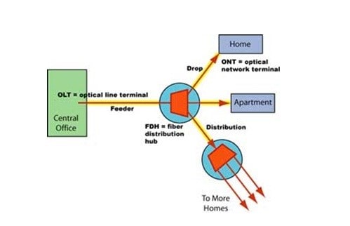 شکل زیر شمایی از یک شبکهی معمول PON به همراه لوازم مورد نیاز در دفتر مرکزی، مرکز توزیع فیبر و خانه را نشان میدهد. کابل “feeder” کابلی است که از در دفتر مرکزی از OLT منشعب شده و به مرکز توزیع فیبر، که همان محل قرارگیری اسپلیتر PON است میرود و سپس به کابلهای توزیع،که به سمت مکان مشتری کشیده شدهاند می پیوندد. در نهایت نیز از کابلهای drop برای اتصال نهایی به ONT استفاده میشود.