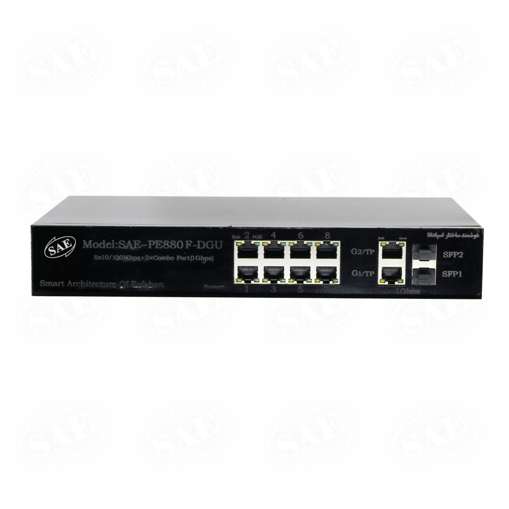 سوییچ 8 پورت هوشمند ساختار اسپادانا SAE-PE880-FDG -U ، توانایی انتقال توان به همراه دیتا از مبدا به مقصد از طریق یک کابل شبکه را داراست.این سوئیچ از 8 پورت شبکه با سرعت انتقال دیتا در هر پورت شبکه برابر10/100Mbs و با بکارگیری 2 پورت combo به صورت SFP و RJ45 با سرعت گیگابیتی در بخش Uplink تشکیل شده است. قابلیت Combo port امکان اتصال دستگاههای با رابط RJ45 و SFPرا فراهم کرده است تا کاربر انعطافپذیری بالاتری به دست بیاورد و از سرعت تبادل چند گیگابیت برای تبادل اطلاعات استفاده کند. همچنین 8 پورت شبکه قابلیت انتقال توان با استاندارد صنعتی IEEE 802.3af را برای هر دستگاه PoE استاندارد دارد. این محصول با بکارگیری الگوریتم پیشرفته سنجش خودکار دستگاه های اتصالی(advanced auto-sensing)، توان را بصورت خودکار توسط کابل شبکه تنها به دستگاههایی که استاندارد صنعتی IEEE 802.3af را پشتیبانی میکنند، تحویل می دهد. این مزیت می تواند اتصال دستگاههای غیر PoE به این محصول را بدون مشکل پشتیبانی کند.