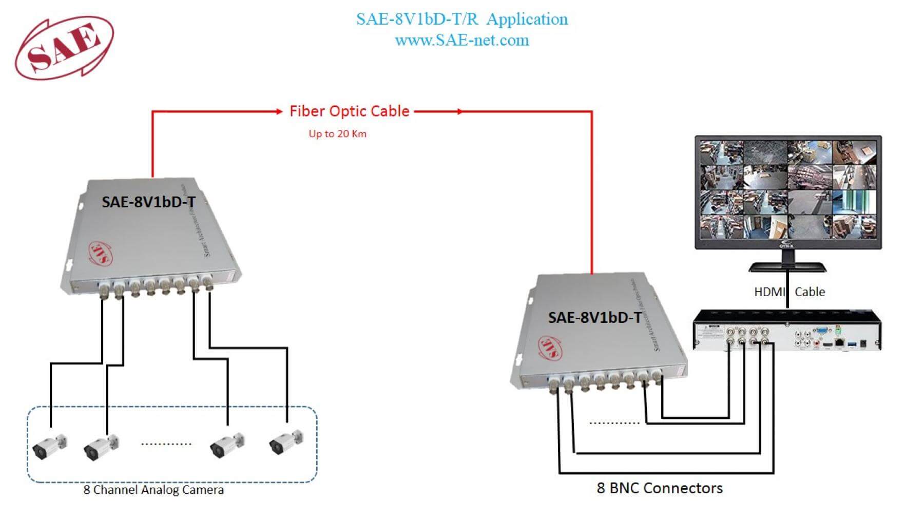 این محصول برای استفاده وسیع در حوزههای CCTV، حفاظت تصویری و امنیت ملی طراحی و ساخته شده است. همچنین LEDهای نشان دهنده وضعیت SAE-8V1bD-T_R کنترل بی مورد از مرکز کنترل را حذف نموده است. سری محصولات مبدل ویدئو آنالوگ در دو نوع استند الون و رک مونت در هنگام سفارش تعیین و تولید می شود.
