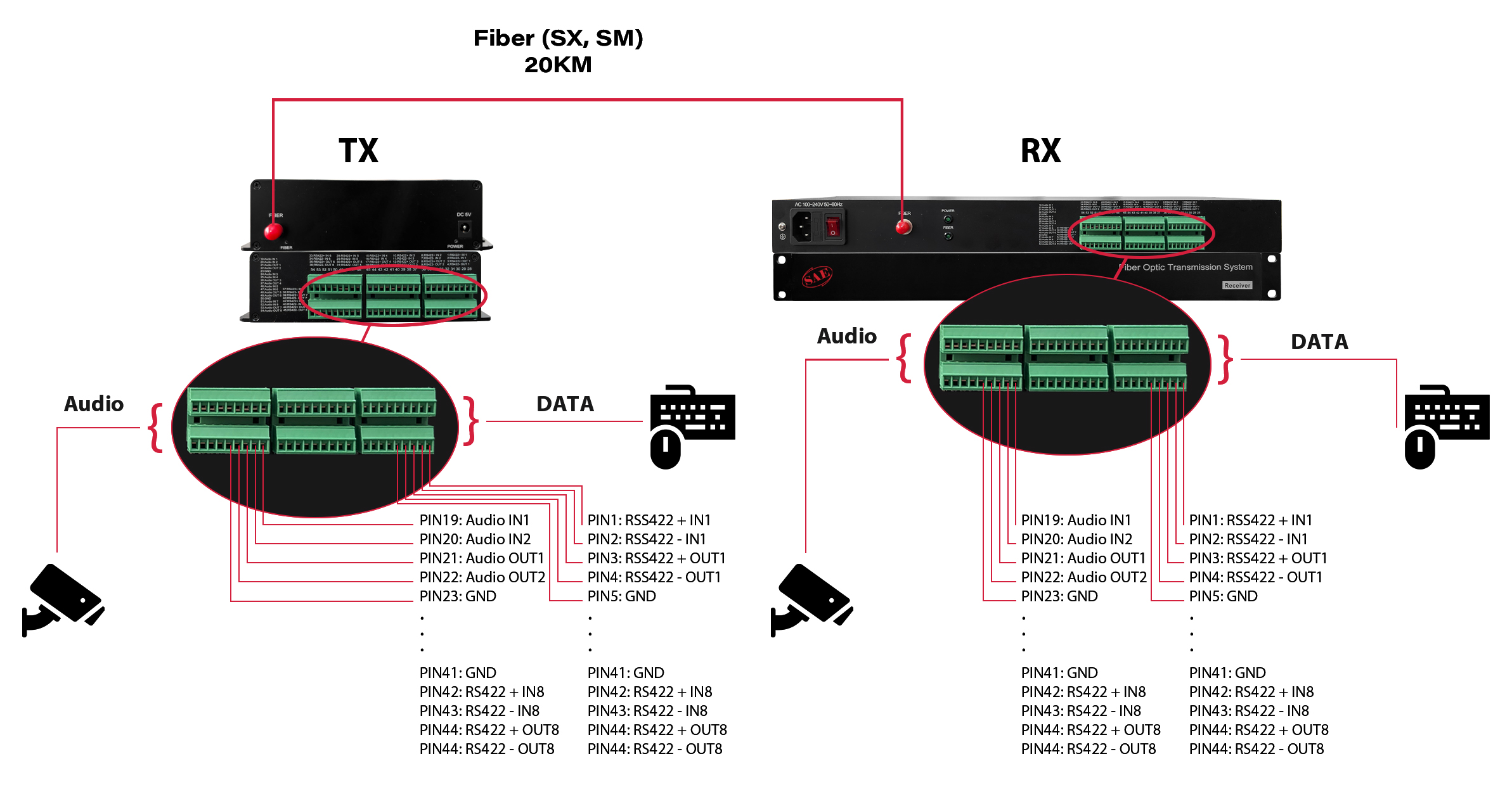 SAE-8bD8bA-TRX یک ترنسیور فیبر نوری پیشرفته و باکیفیت صنعتی است که مجهز به ۸ پورت دوطرفه دیتا (RS232/RS422) و ۸ کانال صوتی دوطرفه میباشد. این دستگاه بهطور خاص برای انتقال با دقت بالا و بدون افت کیفیت سیگنالهای صوتی و دادهای در فواصل طولانی طراحی شده است.