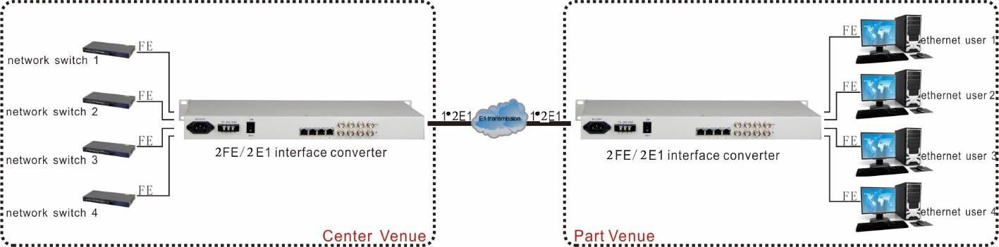 | 2 E1 ports transmission | 2FE(wire speed 100M)Ethernet ports |
