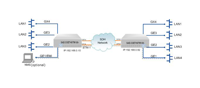 مبدل SAE-COETHSTM-155 رابط انتقال SDH برای اترنت و STM-1 را مهیا می کند. این محصول دارای 4 پورت گیگا اترنت (سه پورت الکتریکال GE1-3 و یک پورت اپتیکال GX4 و 2 رابط STM1 به صورت اپتیکال فیبر می باشد. خروجی این مبدل پورت فیبر با پروتکل SDH می باشد. در حقیقت این مبدل فریم اترنت را به فریم SDH تبدیل کرده و با استفاده از بستر SDH مخابرات , پورت اترنت را به مقصد منتقل می کند. این محصول مطابق با استانداردهای ITU-T و ملی مربوطه طراحی شده است و می تواند انواع مختلفی از شبکه های رایج مانند نقطه به نقطه ، لینک ، شبکه نوع T ، شبکه حلقه و غیره را پشتیبانی کند.